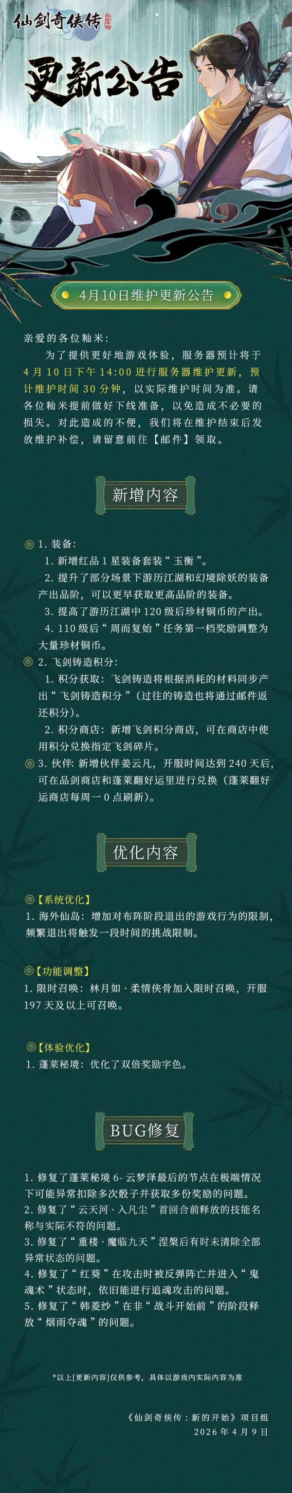 《仙剑奇侠传:新的开始》4月10日维护更新公告
