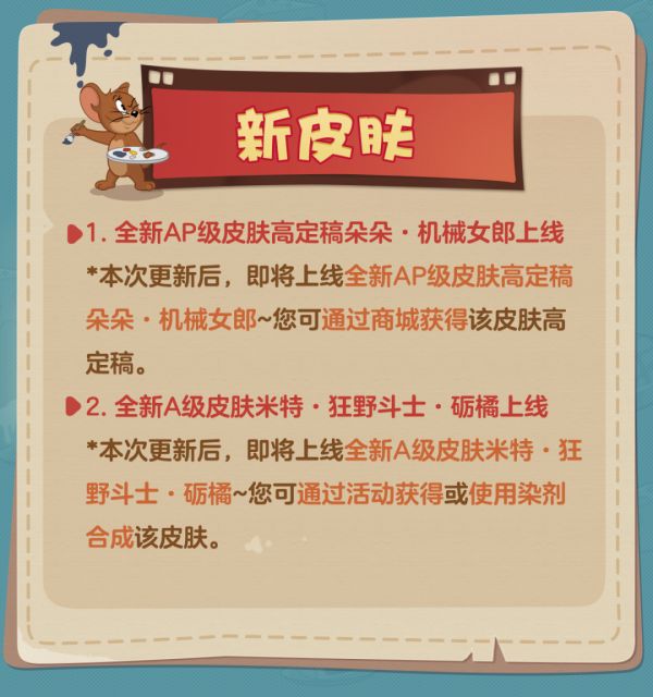 *本次更新后,即将上线全新A级皮肤米特·狂野斗士·砺橘~您可通过活动获得或使用染剂合成该皮肤。