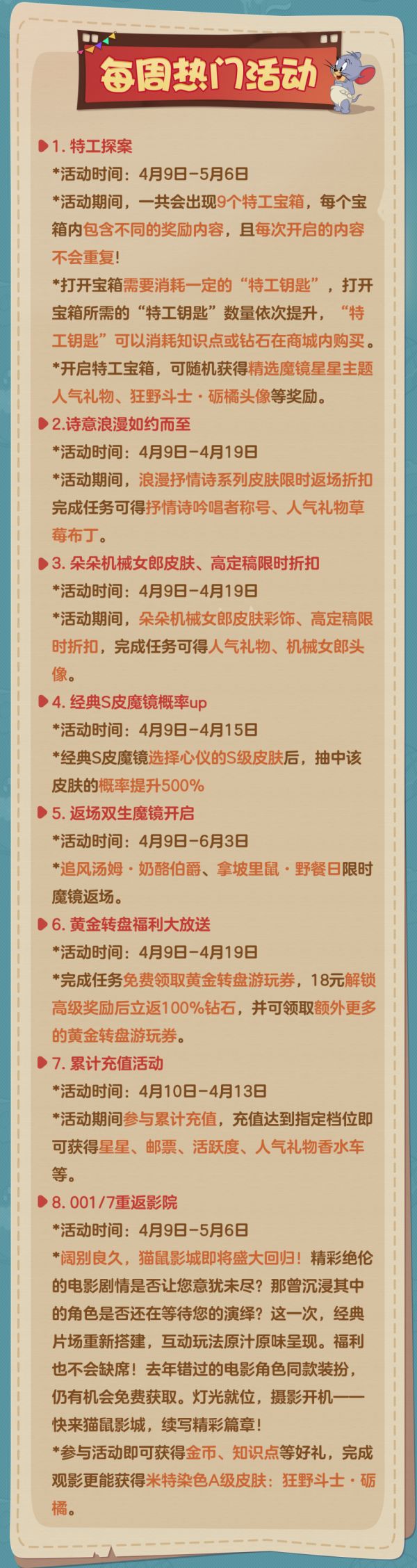 以上就是本周(4月9日)更新维护的全部内容啦!感谢小伙伴们对于《猫和老鼠》手游的支持和喜爱,愿欢乐永远陪伴大家左右!