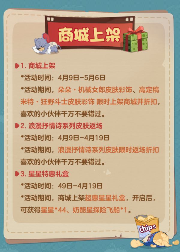 *活动期间,商城上架超惠星星礼盒,开启后,可获得星星*44、奶酪星探险飞船*1。
