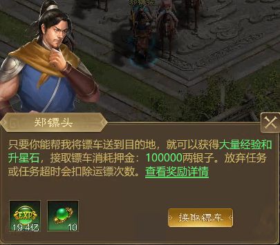 奖励提前预览:玩家可在主城与 NPC 郑镖头对话,打开运镖奖励预览界面,清晰查看不同品质镖车对应的奖励内容,按需选择运镖策略。