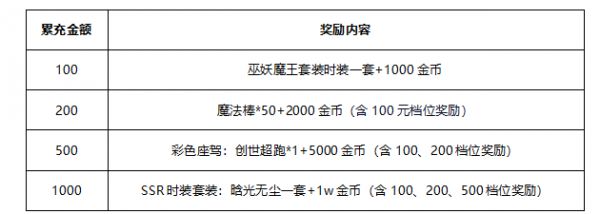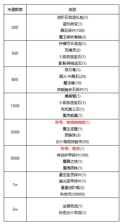 奖励说明:充值达到对应金额,即可领取该档位及以下所有奖励