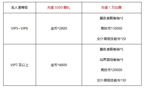 活动时间内,所有线下名人堂VIP5及以上玩家,在活动期间内的充值,达到要求后可以获得额外奖励哟!(只能领取对应VIP等级奖励)~
