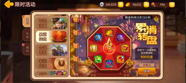 活动内容:活动期间消耗元宝到达指定数量,即可获取转盘机会,累计一定次数后即可获得额外奖励。