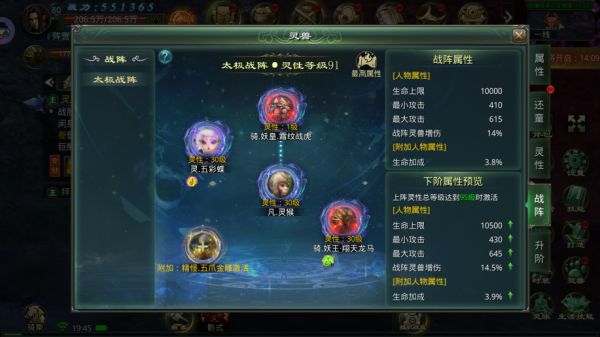 修真者还可以利用战阵系统,灵兽编入阵中,激活阵眼为角色提供属性加成。战阵需要优先激活连线的阵眼。激活后即可激活附加阵眼。战阵中灵兽灵性等级越高,为人物提供的属性加成也越丰厚。
