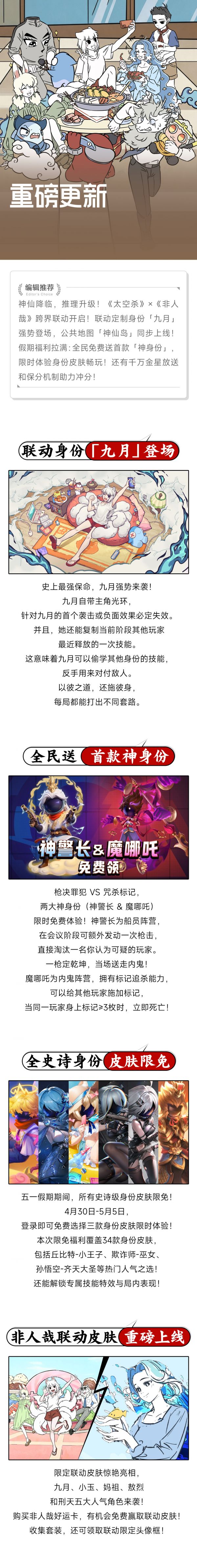 最强船员「九月」来袭:首刀免疫,技能复制!联动「限定皮肤」登场,非人哉五大人气角色集结太空!假期福利拉满:全民送两款神身份「神警长&魔哪吒」,全史诗身份皮肤畅玩,还有千万金星限时放送!