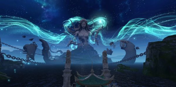 暾将出兮东方,照吾槛兮扶桑。抚余马兮安驱,夜皎皎兮既明。祭祀之夜,环铃声声,唤起磷火涌现而出,遥遥归聚于娲皇圣像之上。点点微芒与星光、月光一同照彻夜幕中的巫都,如同点起明灯,引领着失迷路途的游子回归故土,长息得宁。