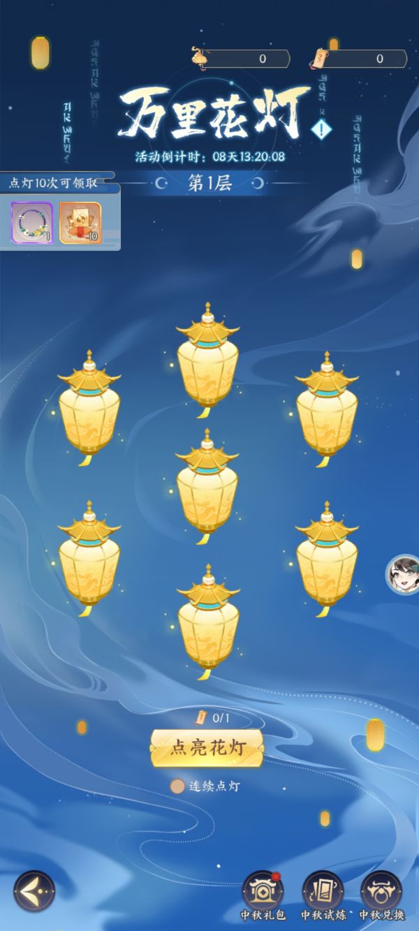 御风赏月活动内,参与中秋试炼和趣味点亮花灯玩法,即可获取豪华大奖!
