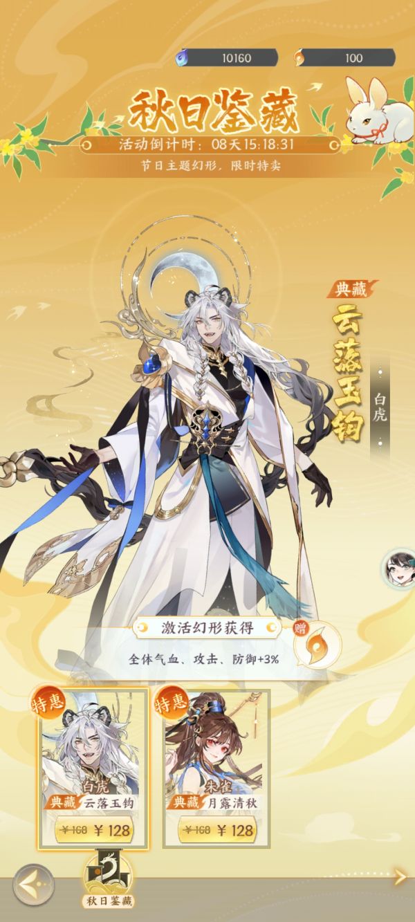 活动期间,中秋节主题 白虎典藏皮肤·云落玉钩、朱雀典藏皮肤·月露清秋 限时特惠放送。