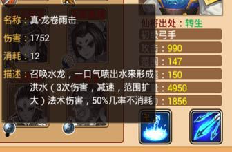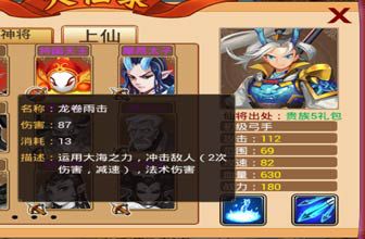 2.小白龙:(贵族5礼包可得)(可提神)小白龙作为充值赠送的仙将用起来还是相当不错的,推图技能龙卷雨击前期弓手里最好用的刷图技能!高伤两段打击,还是法术伤害,还附带减速效果,PK技能就比较鸡肋了,没提神前只能打四,提神后可以同时攻击六个敌人还是相当不错的。由于其可持续成长性,培养他准没错,升到大圣仙将后,小白龙的全面能力就能很明显的体现出来了。