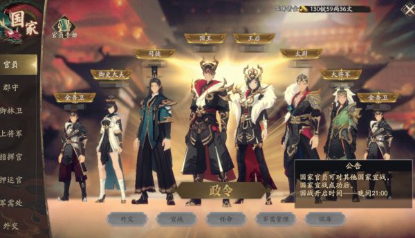 太尉:国家结盟/解盟,发起国战,查看军情,国家公告,任命官员,国家指挥