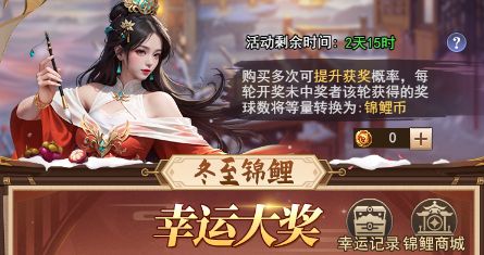 亲爱的主公大人,天气逐渐寒冷,小乔准备了一个暖心暖意的贺冬活动,庆祝今年里的最后一个寒冬腊月~ 锦鲤福利抽终极大奖,豪华礼包专属回馈,限时瑞雪礼遇叠加奖励!活动将于12月20开启,小乔和主公共同举杯庆祝冬至的来临!