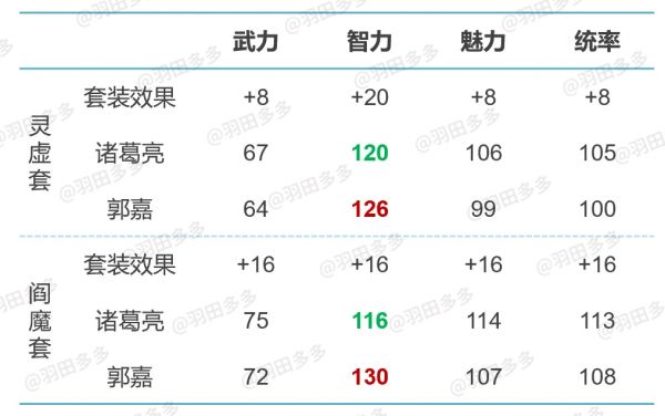 如果要追求极限智力,诸葛亮最适合穿灵虚套,郭嘉最适合穿阎魔套。但无论郭嘉穿什么样的套装,他的智力都是高于诸葛亮的。除了套装之外,如果郭嘉携带【统率星辰】并学习了辅助技能【兵法】,增加统率的同时,还能从中额外获得智力。也就是说,一个作为主C的郭嘉,是无论如何都不会在智力比拼上输给诸葛亮的,在前期,能够非常好地克制诸葛亮。但如果到了后期,仅仅是智力比拼获胜还不够,魅力统率都比不过的话,克制诸葛亮的能力依然非常有限,考虑到主流的诸葛亮都是穿灵虚套堆极限智力,这个时候如果郭嘉穿阎魔套,其魅力和统率刚好能比灵虚套的诸葛亮更高。因此,S1获取的阎魔套,就是郭嘉毕业套了。当然,在S0还没有获取到阎魔套之前,郭嘉也可以带灵虚套,输出的压制力也比较强。