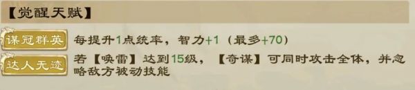 诸葛亮的技能搭配基本不考虑武力有关的技能,因此当诸葛亮的智力比拼获胜后,除开智力比拼胜利带来的迷阵全体混乱+暗谋增减伤效果+流言内讧+落雷增伤以外,这些拼统率和魅力的技能对应效果也会生效: