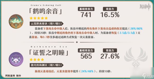 ◆武器的选择(省流版):循环最为关键,优先鹤鸣/证誓;保证充能可选天空/尘世,4星武器可选西风/纯水/无垠等;金珀效果一般、讨龙更需充能;输出玩法还是鹤鸣,其他武器差距不大。