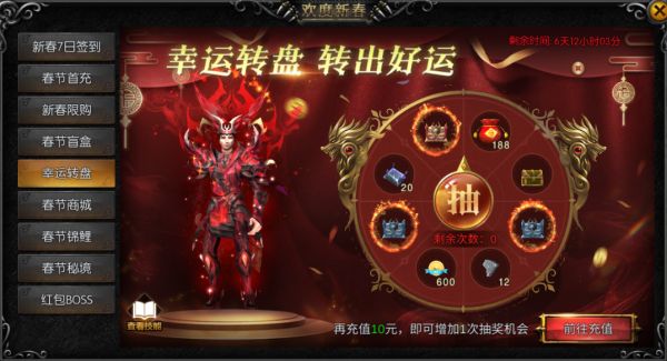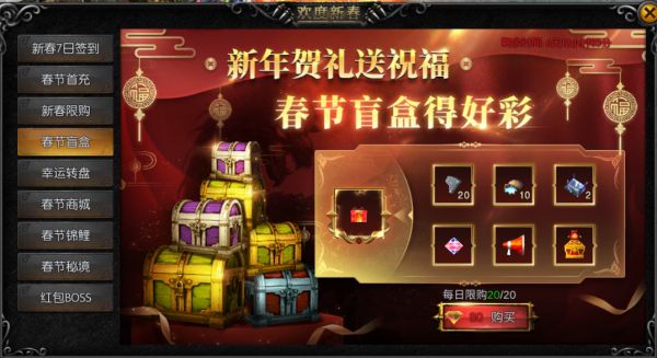 活动期间,通过购买限购礼包等活动获得福袋,可以在新春商城兑换龙年坐骑、灵翼幼龙守护、千里传音-龙年等超值礼品。