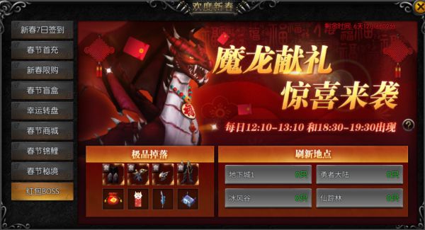 活动期间,红包Boss会在12:10、18:30在勇者大陆,冰风谷、地下城1、仙踪林4个地图的随机地点各刷新1只,击杀后会大量掉落惊喜礼盒,更有一定概率爆出高阶装备。