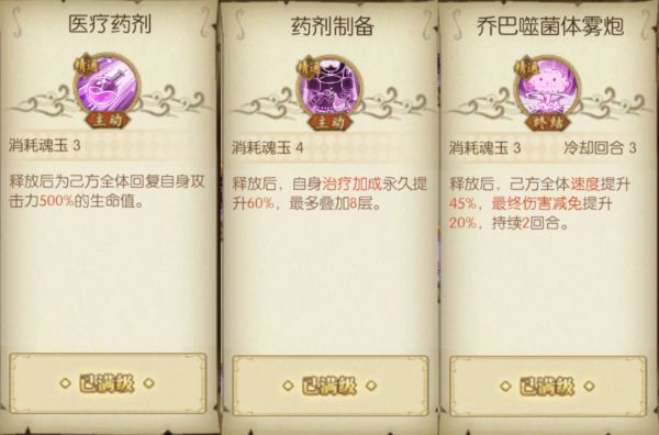 1.强化之躯天赋:第一个回合释放主动技能药剂制备后,下一个回合释放主动技能,终结技能以及进入奥义延展后得到的增益效果都是不一样的,该天赋分别为队伍增强输出能力、清除负面效果以及提升乔巴自身坦度。该天赋也向我们提示了释放技能的顺序,先释放药剂制备,再根据战场情况选择用医疗药剂或者噬菌体雾炮。