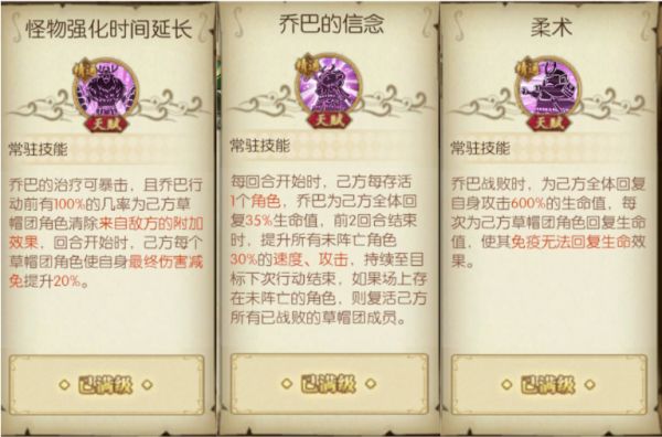 1.奥义延展:乔巴释放奥义进入延展状态后,移动到前排,每回合有5次无敌效果,该状态令乔巴进入延展后可以在前排抗伤害,变相增加了队伍的坦度,提高了队伍的生存能力。