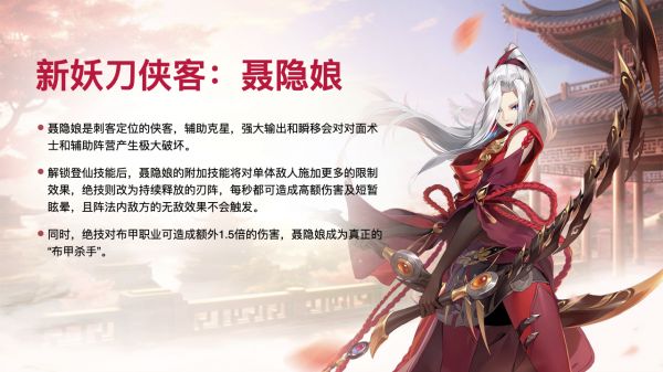 作为妖刀系列侠客,聂隐娘是刺客定位的侠客。辅助克星,强大输出和瞬移会对对面术士和辅助阵营产生极大破坏。解锁登仙技能后,聂隐娘的附加技能将对单体敌人施加更多的限制效果,绝技则改为持续释放的刃阵,每秒都可造成高额伤害及短暂眩晕,且阵法内敌方的无敌效果不会触发,同时,绝技对布甲职业可造成额外1.5倍的伤害,聂隐娘成为真正的“布甲杀手”。