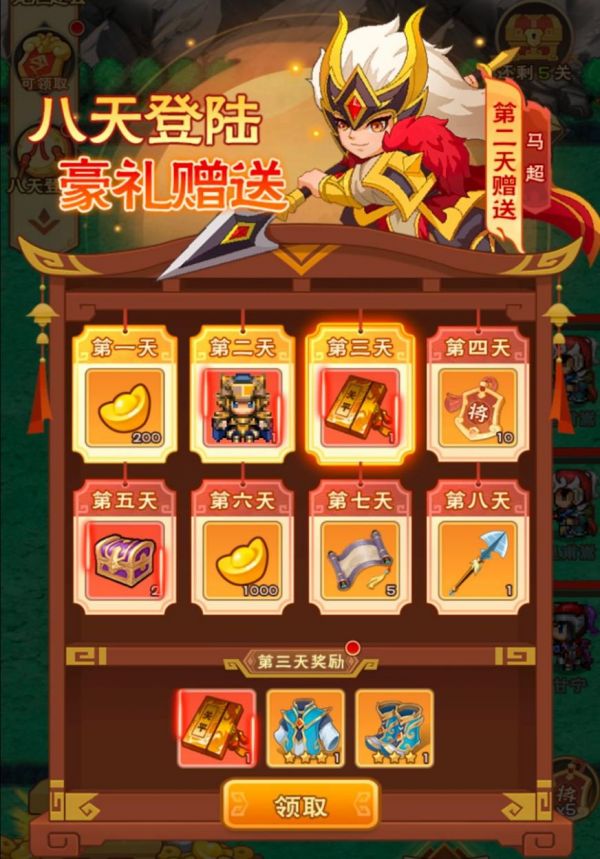 每日登录并签到即可领取福利,大量元宝跟武将马超在等着你噢~