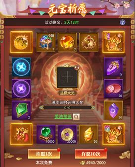 元宝祈愿限时开启,可抽取极品奖励,随心切换奖池,内含自选4星红装、4星饰品自选、将星神魄、卫将军魂等奖励