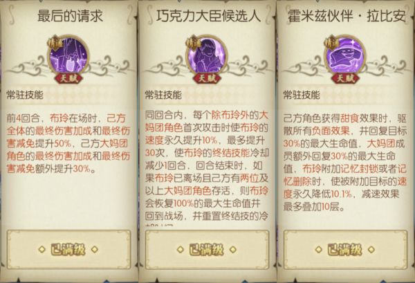 布玲还有许多重要天赋:【最后的请求】提供大量伤害和减伤;【巧克力大臣候选人】提供回到战场持续战斗的能力;【霍米兹伙伴·拉比安】兼具清除己方debuff、回复己方生命、降低敌方速度三大效果。