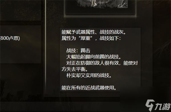 踢击是一个朴实无华且使用的战灰,这玩意在所有的近战武器上都能使用,而且能附加厚重属性,战技效果就是打断对方的动作,获取位置在习战者的破屋,花费卢恩就能购买。