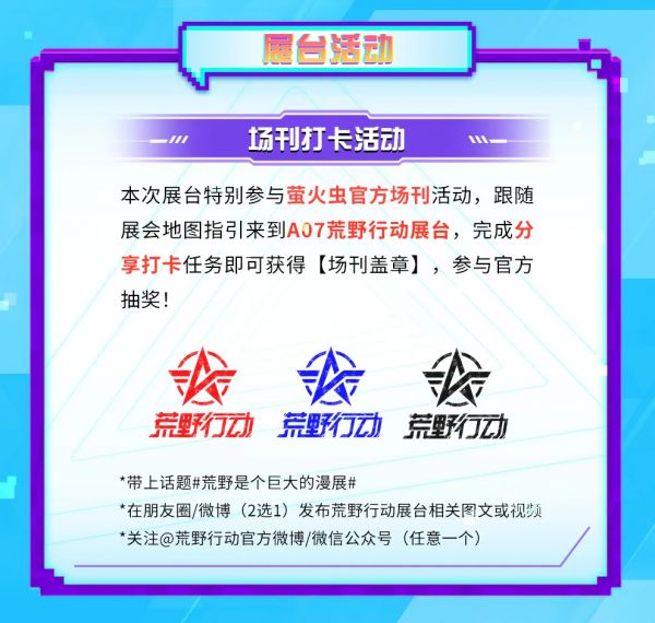 来现场完成分享打卡任务,还能获得【场刊盖章】,参与官方抽奖。记得关注 @荒野行动官方微博 或 官方微信公众号,分享时别忘了带上话题#荒野是个巨大的漫展#哟~