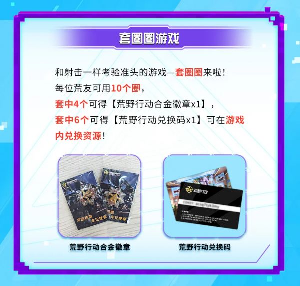 作为一名合格的荒友,你的枪法一定很准吧,是时候证明你的实力了!和射击一样考验准头的现场套圈了解一下?套中4个可得【荒野行动合金徽章x1】,套中6个可得【荒野行动兑换码x1】,兑换码可以在游戏内兑换资源哦!