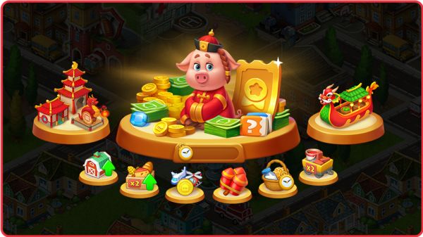 这是一个全新主题的通行证,通过完成通行证任务获得积分、解锁阶段奖励。可以获得4个全新涂装<招财牛><招财猪><聚财舟><祥瑞港>、以及主题头像一个。快来用国风主题涂装装饰你的城镇,为牛牛和猪猪穿上招财服!