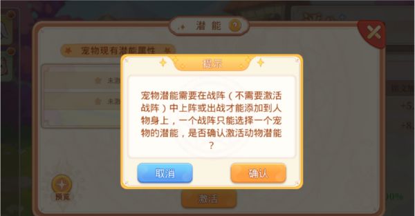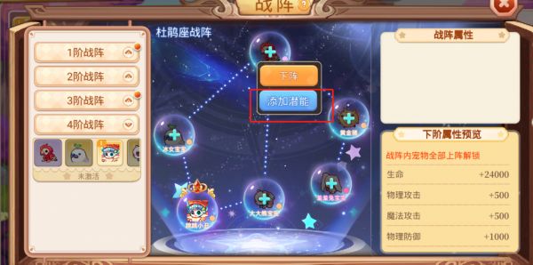 ④、已激活潜能的宠物需要在战阵中选择「添加潜能」,同战阵中仅有一只宠物潜能可生效(战阵不需要激活)。