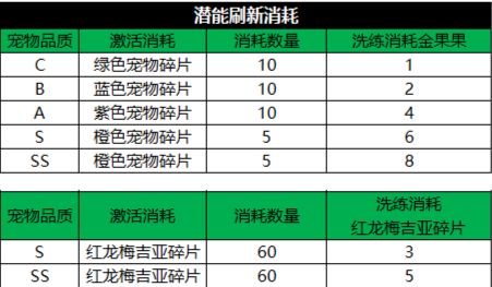 ②、宠物通过消耗对应品质宠物碎片激活「潜能」(红龙梅吉亚需消耗红龙碎片),激活随机获得2条潜能属性;