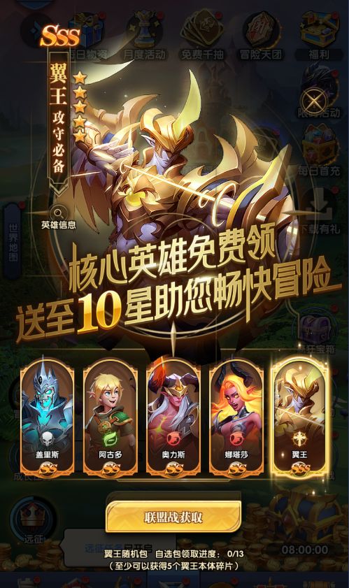 参与联盟战等玩法,将能获得天神种族的SSS级英雄——翼王(拥有增益buff,治疗、解控能力的强力牧师英雄);