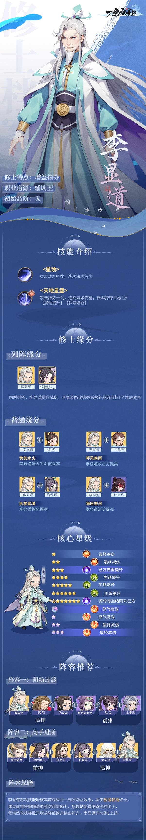 李显道是功能性很强的辅助修士,列阵缘分大多以天品质为主,前期过渡可围绕自带增益效果的修士搭配。