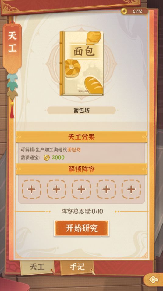 当街主等级达到7级后就会自动解锁天工阁啦,届时直接建造即可。天工阁有两个栏目,分别是天工和手记。