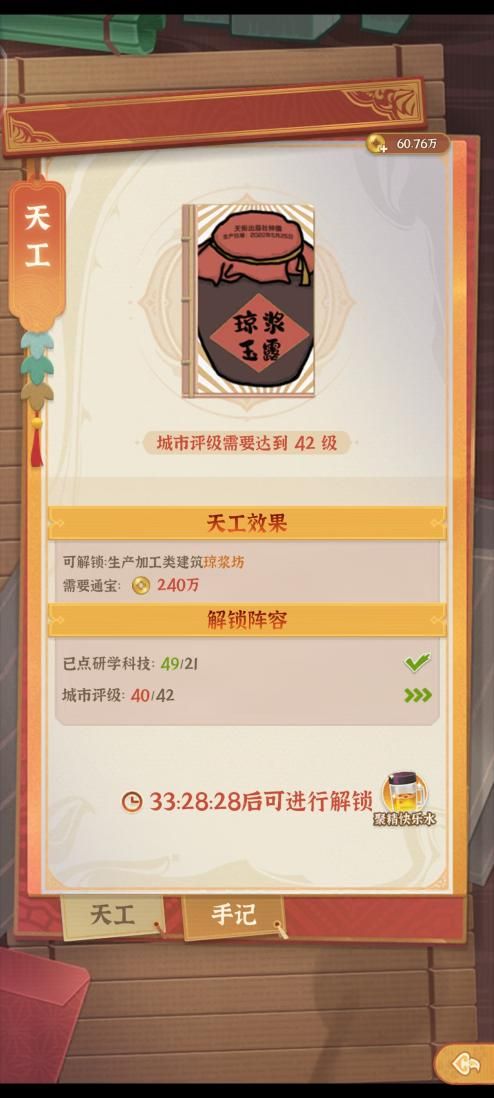 值得注意的是,在天工阁每解锁完一次建筑,都需要等待一定的时间才能解锁下一个建筑,如若想加快进程,可通过聚精快乐水来缩短时间。
