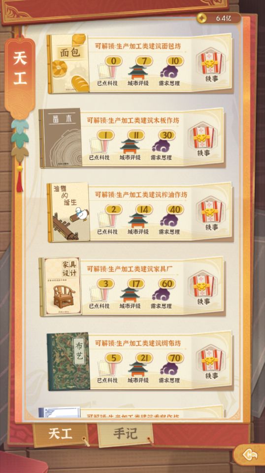 在手记中,可以查看不同生产加工类建筑解锁需求,还可以查看关于其已解锁建筑的轶事。