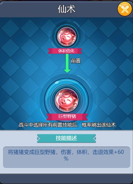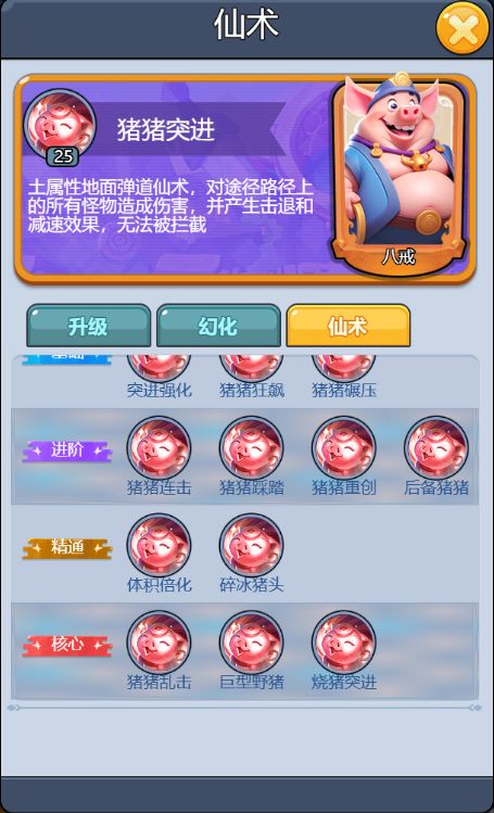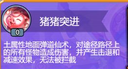 猪猪突进:土属性地面弹道仙术,对途径路径上的所有怪物造成伤害,并产生击退和减速效果,无法被拦截。