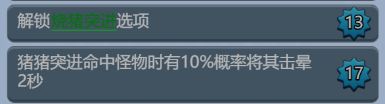 17级:猪猪突进命中怪物是有10%概率将其击晕2秒。