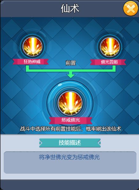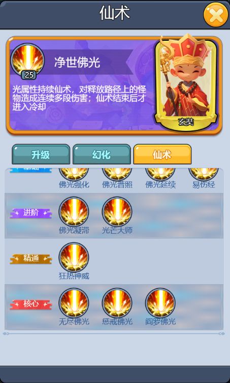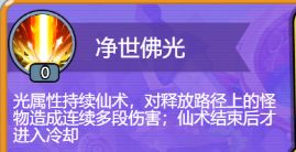 净世佛光:光属性持续仙术,对释放路径上的怪物造成连续多段伤害,仙术结束后才进入冷却。