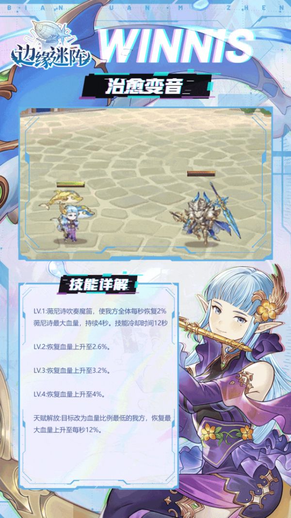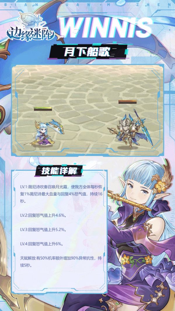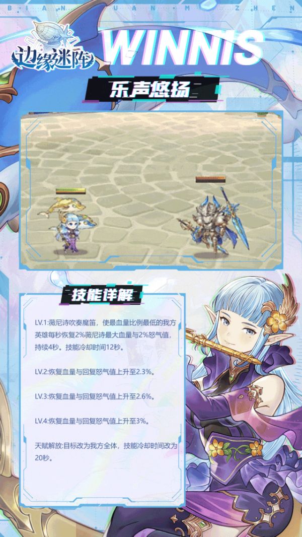 ✦优雅演奏技能详解✦ Lv.1:薇尼诗身在悠扬乐声中时,减少自身10%冷却时间,并每秒回复3%怒气值。 Lv.2:冷却上升至13%,回复怒气值上升至3.6%。 Lv.3:冷却上升至16%,回复怒气值上升至4.2%。 Lv.4:冷却上升至20%,回复怒气值上升至5%。 天赋解放:冷却上升至30%,回复怒气值上升至8%。