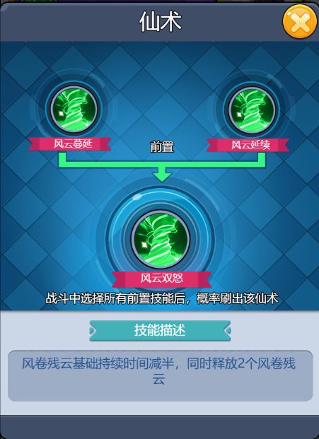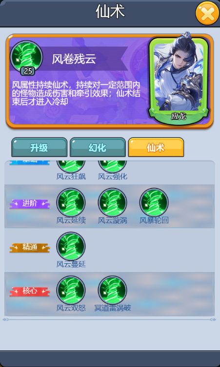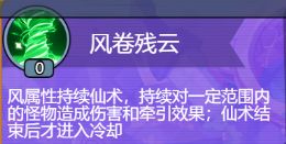 风卷残云:风属性持续仙术,持续对一定范围内的怪物造成伤害和牵引效果,仙术结束后才进入冷却。