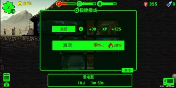屋子越多就越需要电力,居民越多就需要水和食物,而这都是生产得来的。当生产结束时,你需要点击生产设施收集生产资源。如果资源不够用,居民的日常生活开始出现问题,那么你可以使用极速模式,如果成功,这会直接结束此房间当前的生产并获得资源,要注意,极速模式使用次数越多就越容易失败,失败可能会造成火灾甚至辐射生物入侵,所以进行每一次极速模式的时候都要考虑谨慎。