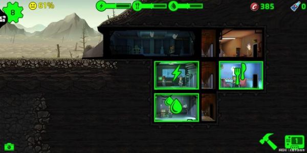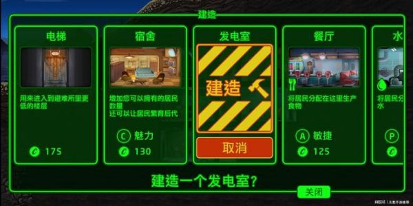 点击小锤子进入建造模式,选择一个房间,在可建筑的位置建造它,发电室,水处理室,餐厅,宿舍等等这种基础设施只占一个位置,而在他们旁边建造同种设施是可以合并的,最多三格房间一同合并,合并的房间可以容纳更多的居民,也可以生产更多的资源。每个建造的房间必须和其他房间连接,保证你的居民遇到灾难时可以逃出去。点开每个房间,不仅可以进行极速模式,还可以对它们进行升级和摧毁,但摧毁可以回收的瓶盖太少太少,是一个绝对不值当的交易。