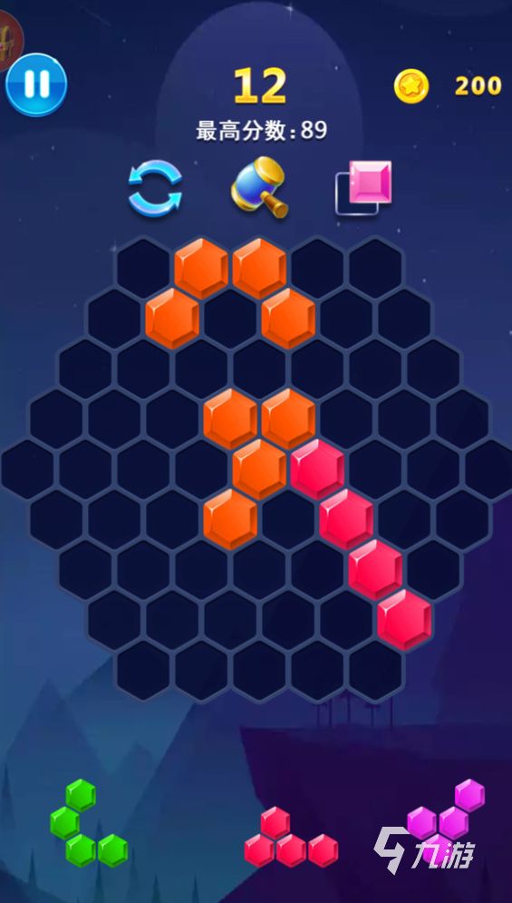 《六边形消消乐》是一款休闲类型的消除类手机游戏,人家进入游戏以后将会看见一个巨大的六边形,这个六边形是空心的,在六边形底下还会有三个形状各异的六边形组成的图形,玩家需要将这些怪异的图形完整的放置于上述的空旷图形当中,玩家每放置一个图形,屏幕下方就会出现一个新的图形,当玩家将所有的途径全部置于六边形方块当中,那么六边形当中的所有方块将会全部消失,然后给玩家兑换成积分。