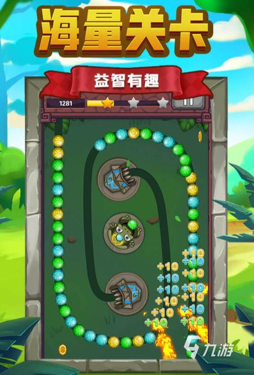 《祖玛传说》是一款十分经典的消除类手机游戏,在这款游戏当中玩家将会扮演一只青蛙在地图当中不断地吐着各色宝珠,地图外圈将会有宝珠不断地向你涌来,玩家需要做的就是相同颜色的宝珠放在一起,至少三个相同的宝珠相连则会进行消除,在后续的关卡当中除开最中心的位置,玩家还能移动到系统指定的区域吐宝珠,一局游戏最多移动三次。