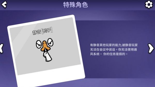 静音[鸭子]:可以让其他玩家闭麦,被静音玩家无法在会议中说话,虽然作为鸭子但是无法使用通风系统,你的任务是假的;