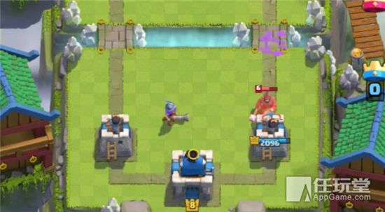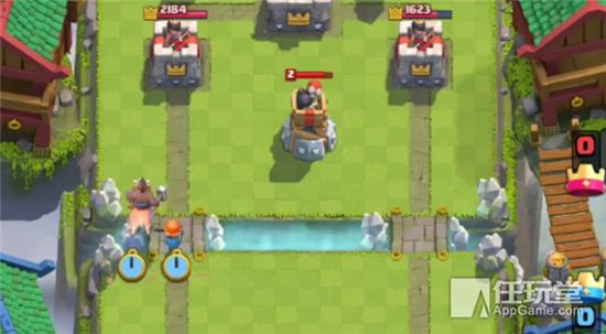 如果对手在黄金防守点放下了建筑,野猪骑士直接过桥的话,是会被建筑物吸引过去的。现在我们有跳猪技巧,可以让野猪骑士直接跃河直奔对手的公主塔。这要看对手建筑物摆放的位置,一般建筑物是不能摆放在正中间的,如果对手的建筑物偏向一边公主塔,那么我们可以选择在另一边使用跳猪技巧。将野猪骑士放在河道最旁边,同时在野猪的身旁放下一个地面部队,就能挤一下野猪的位置,让野猪骑士不得不跃河进攻了。如果对手用的是电塔,那么两边都可以选择使用跳猪技巧。>>