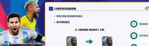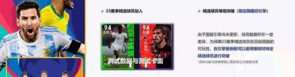 新引擎版本中的同名时刻合并为特定亮点和额外补偿;第23赛季现役球员,新引擎更新后选择将与国际服数据同步;未合并且只有一张卡的玩家不会被额外处理;传奇,亮点球员续约规则:传奇无需续约;获得精彩集锦一年后,他们将自动离开游戏,需要带积分返回游戏;新的用户界面;按钮自定义:自定义按钮布局;战斗室定制:调整换人次数等新功能;新的联赛系统;玩家能力点;新教练小组;